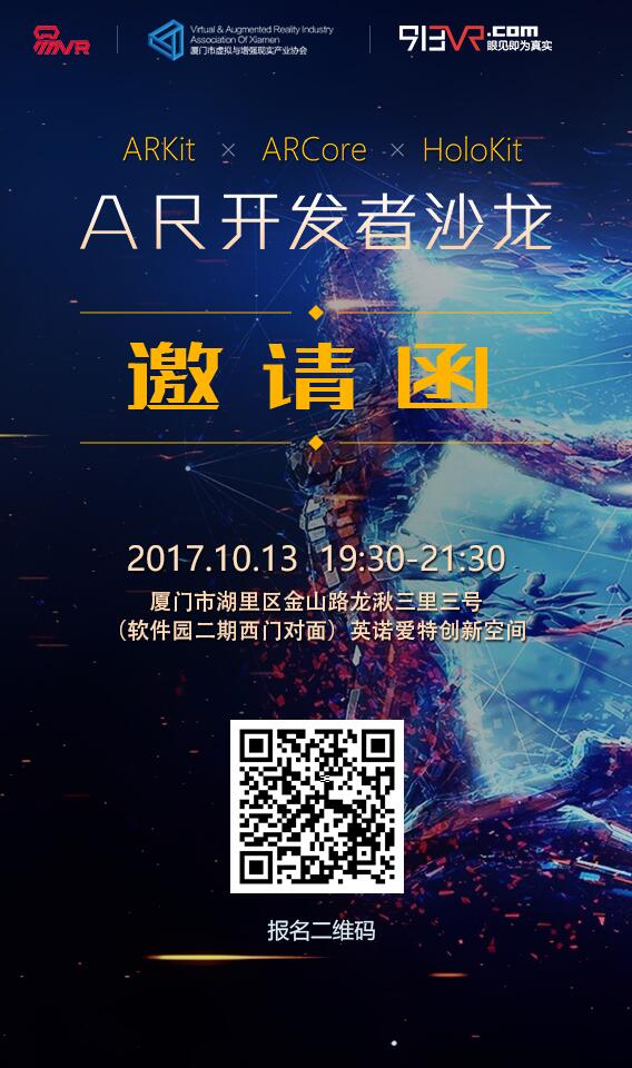 由易VR、913VR、廈門(mén)市虛擬與增強(qiáng)現(xiàn)實(shí)產(chǎn)業(yè)協(xié)會(huì)聯(lián)合舉辦的AR開(kāi)發(fā)者沙龍正式開(kāi)啟報(bào)名,本沙龍旨在解答你對(duì)AR市場(chǎng)或技術(shù)的疑問(wèn),幫助你踏出ARKit & ARCore &HoloKit開(kāi)發(fā)第一步!