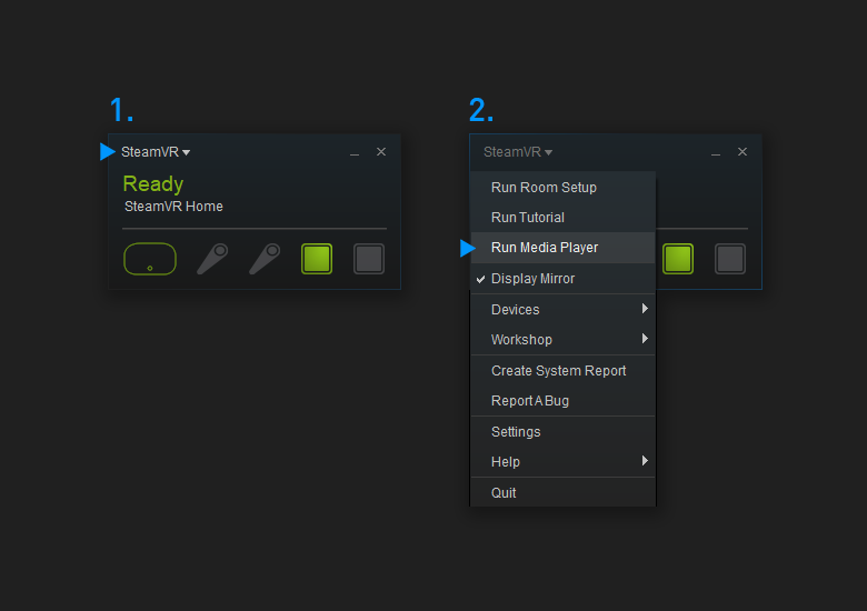 想要運行SteamVR Media Player,你就需要選擇SteamVR Beta,打開SteamVR Status菜單,選擇Run Media Player。