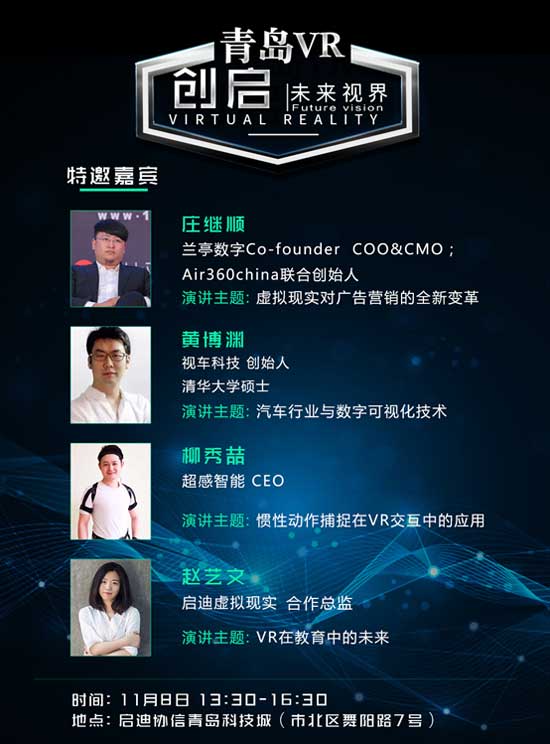 在這樣的背景下,啟迪協(xié)信•青島科技城牽手啟迪控股旗下VR行業(yè)的龍頭企業(yè)——啟迪虛擬現(xiàn)實(北京)科技發(fā)展有限公司,打造青島首個VR行業(yè)沙龍培訓(xùn)基地。11月8日,以“創(chuàng)啟•未來視界”為主題的青島首屆VR行業(yè)沙龍即將啟幕。本次VR行業(yè)沙龍,特邀蘭亭數(shù)字聯(lián)合創(chuàng)始人、COO&CMO莊繼順;視車科技創(chuàng)始人、清華大學(xué)碩士黃博淵;超感智能CEO柳秀喆、啟迪虛擬現(xiàn)實戰(zhàn)略負責(zé)人趙藝文等國內(nèi)頂尖的VR行業(yè)大咖坐鎮(zhèn),探討虛擬現(xiàn)實技術(shù)與傳統(tǒng)行業(yè)結(jié)合的新模式,暢談VR內(nèi)容領(lǐng)域今后的發(fā)展方向與前景。