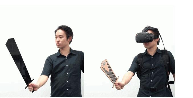 下圖左為體驗(yàn)者游戲中感覺到的武器,而右方為實(shí)際持有的手柄代替物,東大的新成果可以實(shí)現(xiàn)兩者的完全統(tǒng)一。