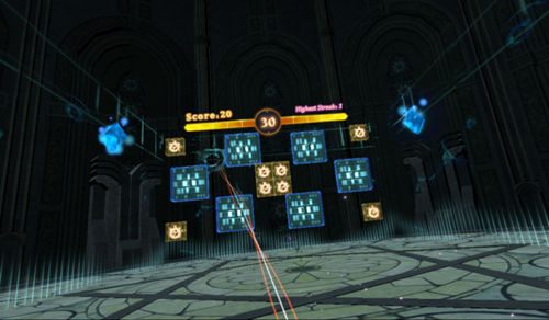 戴上VR頭盔之后,會進入一個充滿未來感的三維立體空間。拿起手柄揮動球拍,將粉色的球擊打到周圍的空間墻上,擊中藍色方塊就能得分~