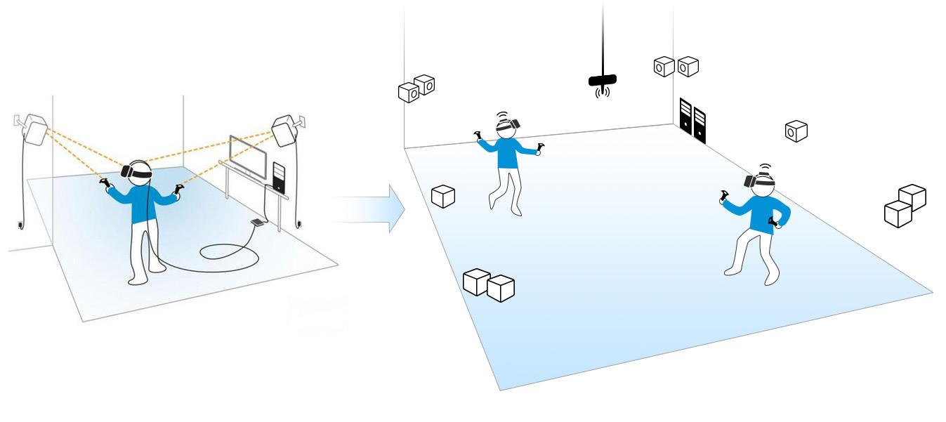 ZVR“矩陣”解決方案采用捕捉精度達(dá)亞毫米級別的光學(xué)定位系統(tǒng),通過高速動作捕捉相機(jī)捕捉在HTC Vive頭顯上布置的mark點(diǎn),識別空間內(nèi)多個玩家在空間中的運(yùn)動軌跡。將玩家從固定位置的體驗方式中解放出來,實現(xiàn)在大空間內(nèi)多名玩家自然交互的沉浸式VR體驗。