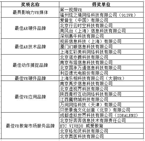 中國(guó)VR/AR行業(yè)應(yīng)用與創(chuàng)新評(píng)選大賽獎(jiǎng)項(xiàng)及得獎(jiǎng)單位如下