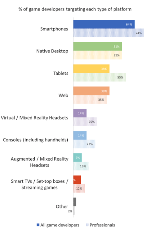 與此同時,雖然我們在以前的研究中發(fā)現,游戲在VR開發(fā)人員中非常流行,但這種行為主要是集中在對游戲有業(yè)余愛好的開發(fā)人員。因此,當我們發(fā)現有25%的專業(yè)游戲開發(fā)者瞄準VR和MR平臺是相當令人驚訝的。