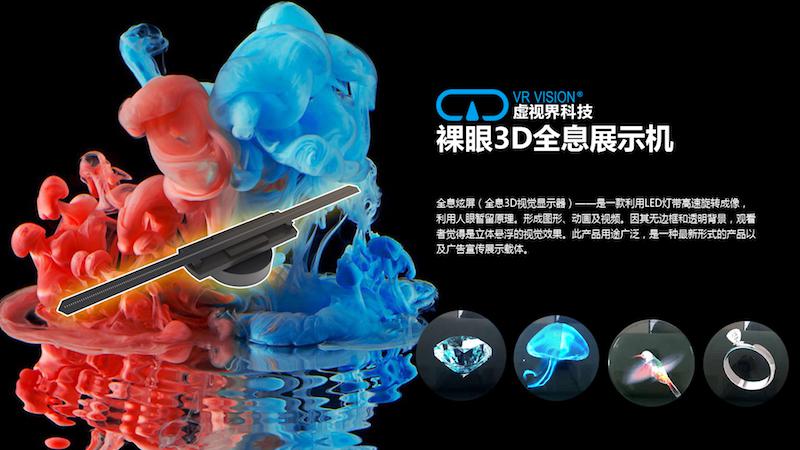 除了大美藝術平臺,虛視界在本次展會上展出的全息產品則是公司另一塊業(yè)務。李志遠告訴我,在全息投影類產品中,比較傳統的方式是所謂的三角塔全息投影,此類產品我們經常在各大科技展會上接觸到,其缺點是造價過高和呈現效果有限。此次虛視界展出的全息廣告機是通過LED燈珠點陣旋轉成像,用戶在看到旋轉的LED點陣時,眼部的視覺殘留會讓大腦形成一個三維立體的畫面。采用這種方式的全息產品非常便于攜帶與展示,而且使用壽命長,造價也相對較低。