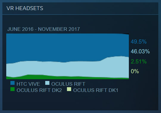 Rift DK2的開發(fā)者套件較上個月也下降了0.8%,空出來的份額被其它頭顯所占有。DK2是在2014年推出的,目前為止在Steam上依舊占有2.5%的市場份額。十一月份消費版Rift和DK2合在Steam平臺總占有率達到了48.5%,而在十月份則為50.9%。