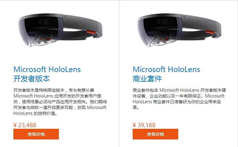 HoloLens是微軟在2015年推出的一款頭戴式混合現(xiàn)實智能頭盔,也是目前在技術上最為成熟的AR設備,今年5月微軟宣布HoloLens在中國正式發(fā)售,分為開發(fā)者版本和商用套件,分別售價23,488人民幣、39,188人民幣。