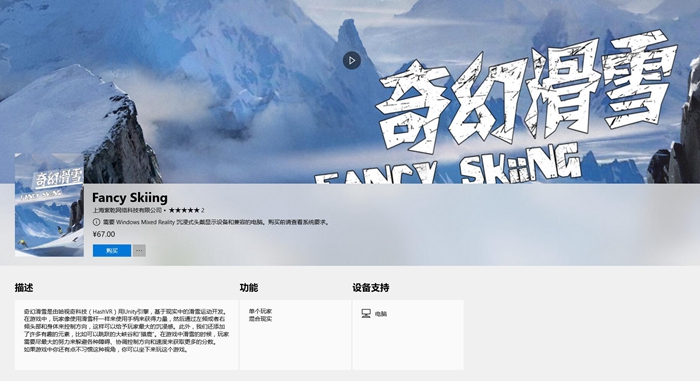 《Fancy Skiing》(中文名《奇幻滑雪》)是一款由北京哈視奇科技有限公司研發(fā),上海紫乾網(wǎng)絡(luò)科技有限公司(7663VR競(jìng)技平臺(tái))發(fā)行的VR體育模擬游戲。本作于2017年12月5日正式登陸Microsoft store微軟官方商城,目前售價(jià)67元人民幣。作為國(guó)產(chǎn)VR游戲的佳作,《奇幻滑雪》憑借其精妙的玩法以及完美的品質(zhì)在玩家心中留下了極好的口碑。