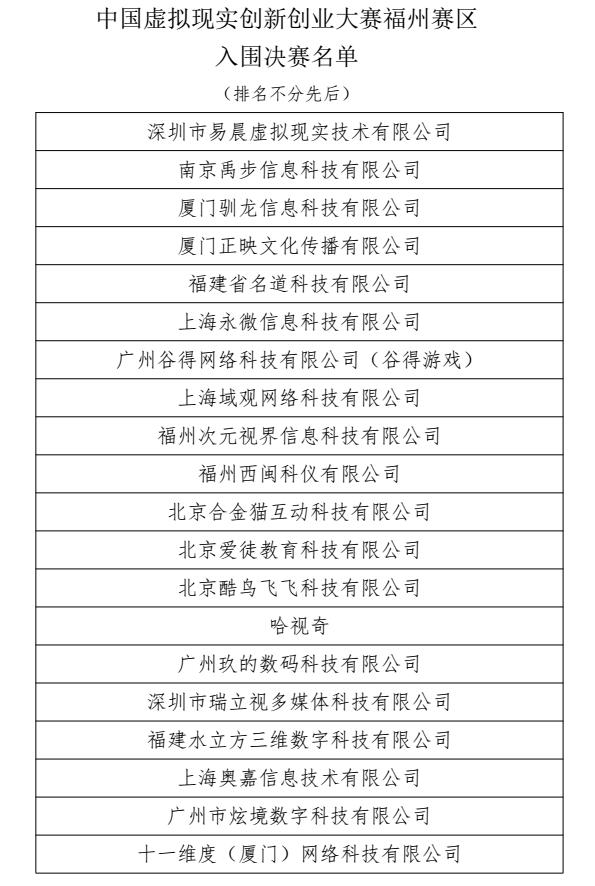 經(jīng)過下午激烈的比賽,和組委會以及專家評審團的評審,中國虛擬現(xiàn)實創(chuàng)新創(chuàng)業(yè)大賽福州賽區(qū)入圍決賽名單公布。恭喜以下20支隊伍進入決賽。