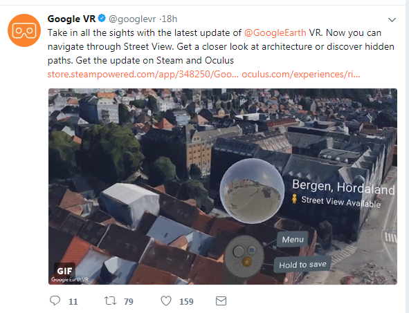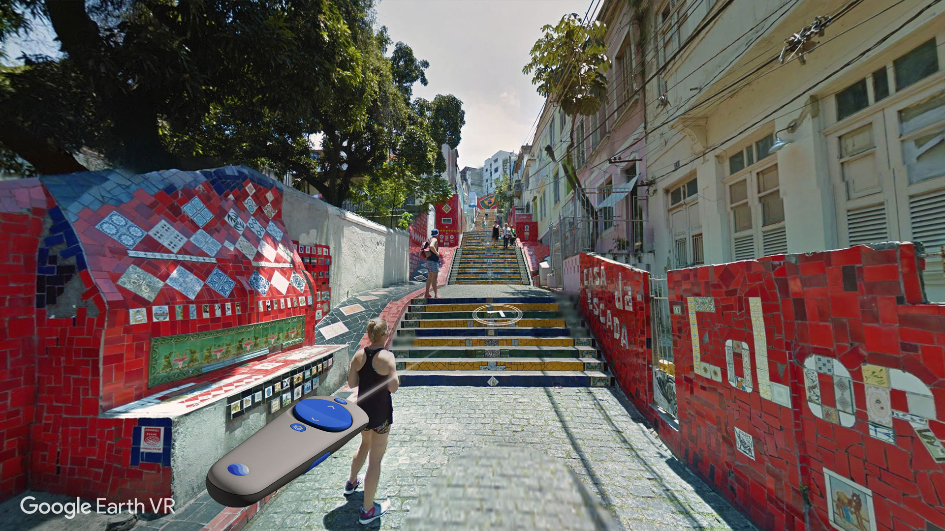 其實早在今年9月,谷歌就將在該應(yīng)用中加入了“街景視圖”,當你查看的地區(qū)有街景圖像,在放大至實際比例時,會在控制器上方看到一個漂浮的光球。此時用戶只需將光球移至面前,就可以查看谷歌預(yù)先拍攝好的360度全景圖像。不過9月份更新的街景視圖看起來并不完善,所以此次優(yōu)化了這個功能,提供了一個更為簡單的方式在VR中漫游城市街景。