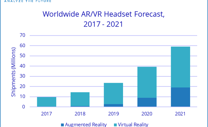 上周,市場(chǎng)調(diào)查機(jī)構(gòu)IDC發(fā)布“全球季度AR和VR頭顯發(fā)貨量調(diào)查”的研究報(bào)告。該報(bào)告預(yù)測(cè)到2021年,VR和AR市場(chǎng)規(guī)模將大幅增長(zhǎng),VR和AR產(chǎn)品出貨量將從今年的960萬(wàn)臺(tái)增加到5920萬(wàn)臺(tái)。
