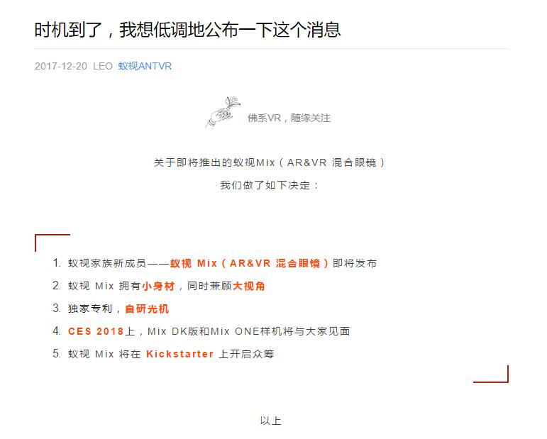 繼蟻視在今年在ChinaJoy發(fā)布了全新升級版蟻視VR套裝2S及蟻視VR頭盔2C后,蟻視在年底再次通過自己的官方微信公號里釋放出自己新的產(chǎn)品計(jì)劃——將在2018年美國CES上展示自己的首款A(yù)R&VR混合眼鏡蟻視 Mix,同期會在Kickstarter上開啟海外眾籌。