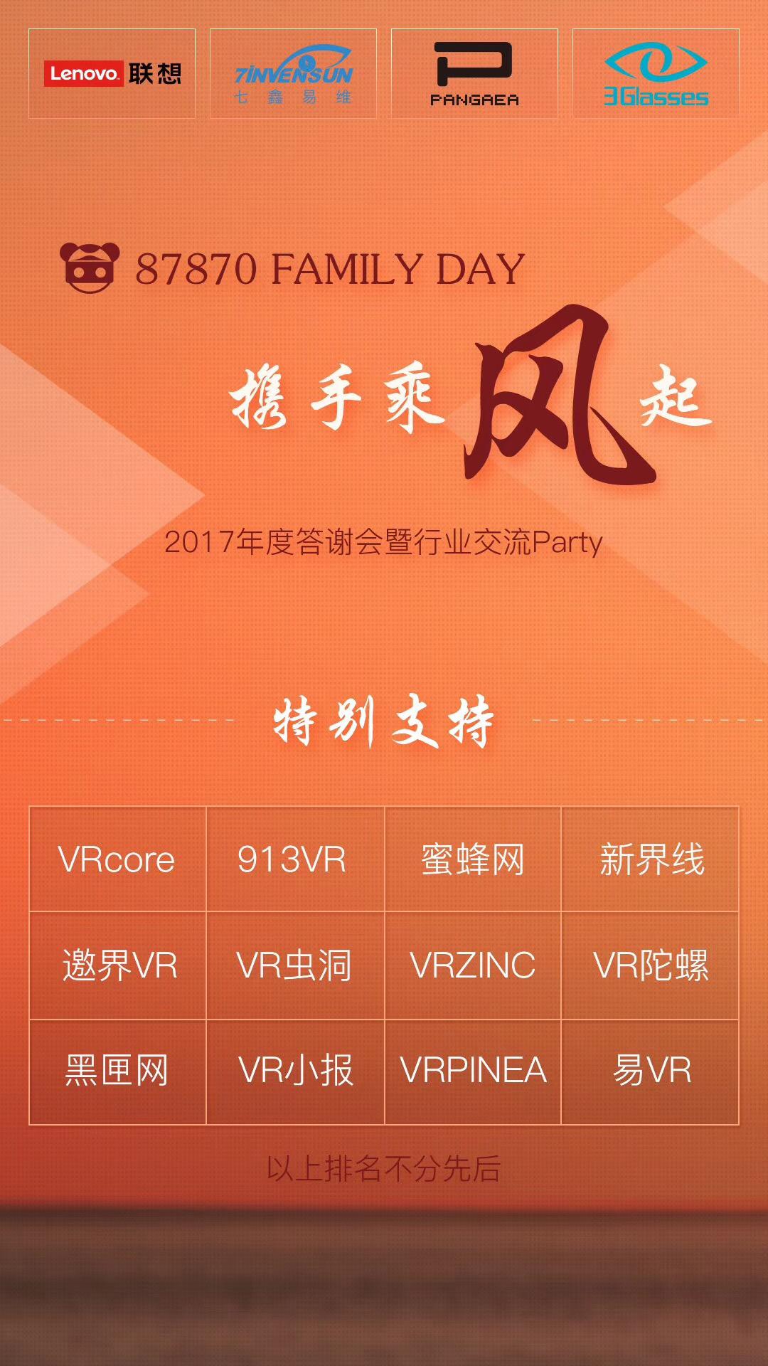 2017年12月27日,國(guó)內(nèi)VR/AR/MR產(chǎn)業(yè)價(jià)值創(chuàng)領(lǐng)者87870攜手聯(lián)想、3Glasses、七鑫易維、龐際網(wǎng)絡(luò)四大合作伙伴共同舉辦的87870 Family Day年度答謝會(huì)暨行業(yè)交流會(huì),在北京招商局大廈順利舉行。本次活動(dòng)邀請(qǐng)了數(shù)百位VR/AR/MR領(lǐng)域的從業(yè)者、媒體代表以及行業(yè)大咖。去歲迎新之際,行業(yè)精英們共聚一堂,在輕松愉悅的氛圍下,回顧2017年、展望2018年。