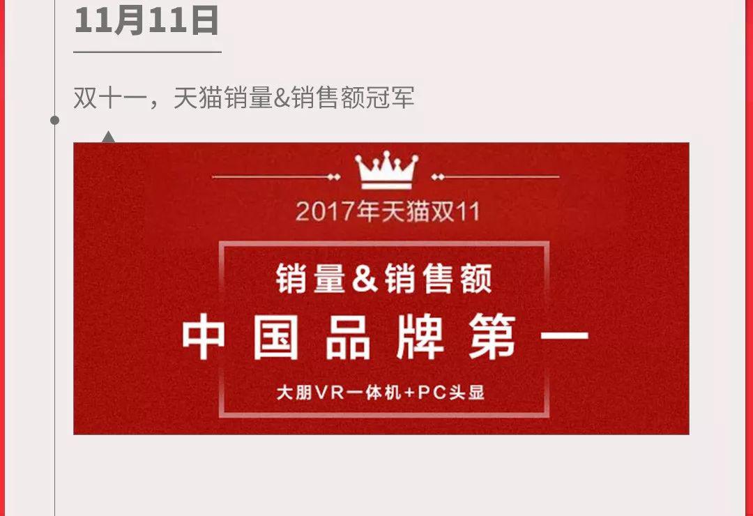 本文是2017年VR行業(yè)年度回顧硬件部分的第二篇,今天我想說說大朋VR(后簡稱大朋)。作為一家在2016年主推VR一體機、到了2017年又推出PCVR產(chǎn)品的硬件公司,大朋的戰(zhàn)略選擇非常值得我們關(guān)注。當我準備進行梳理時,正好發(fā)現(xiàn)其官方微信公眾號也總結(jié)了自家的年度大事,所以我們同樣還是先從幾張長圖去感受一下這家公司在2017年付出的努力和獲得的收獲。