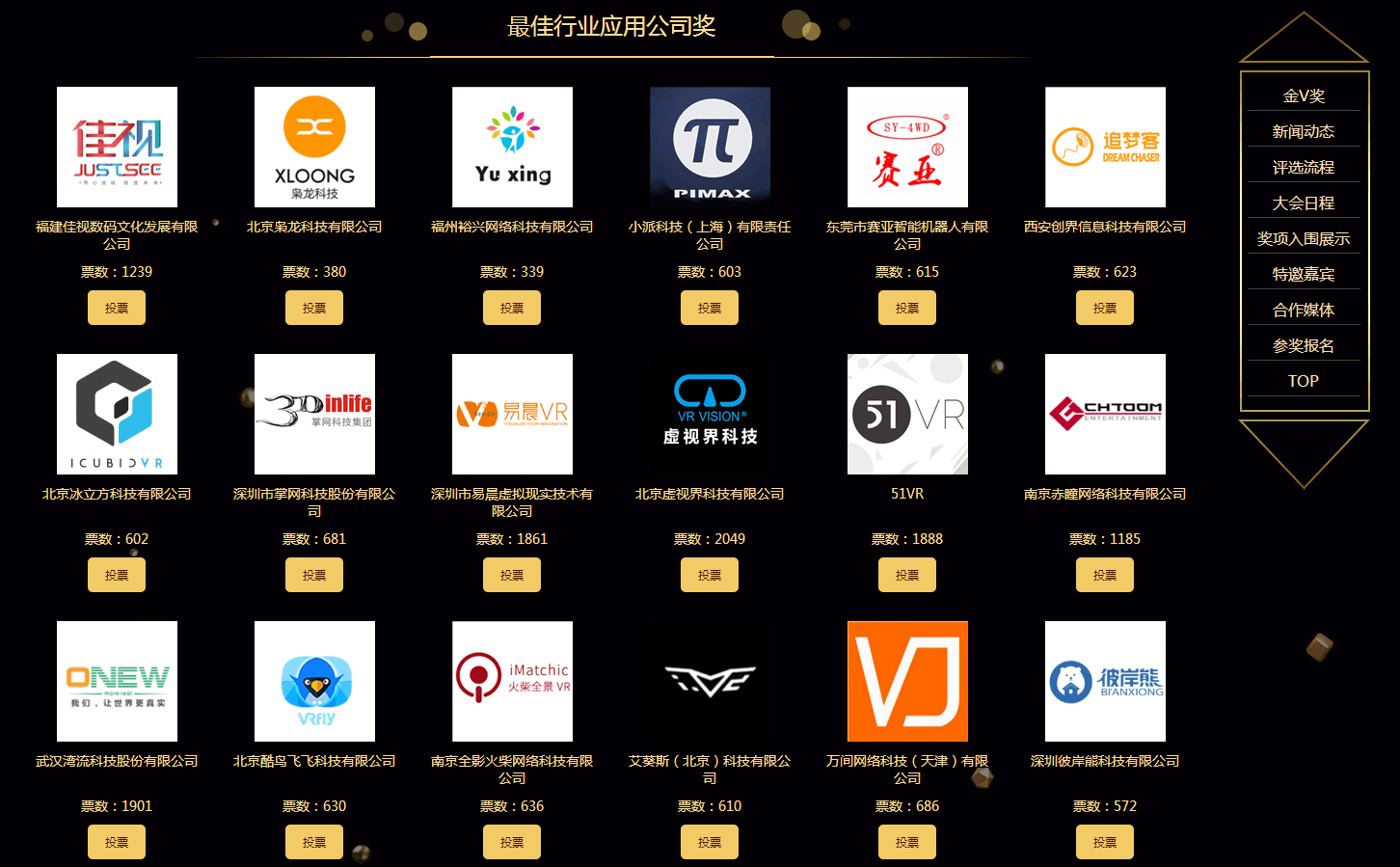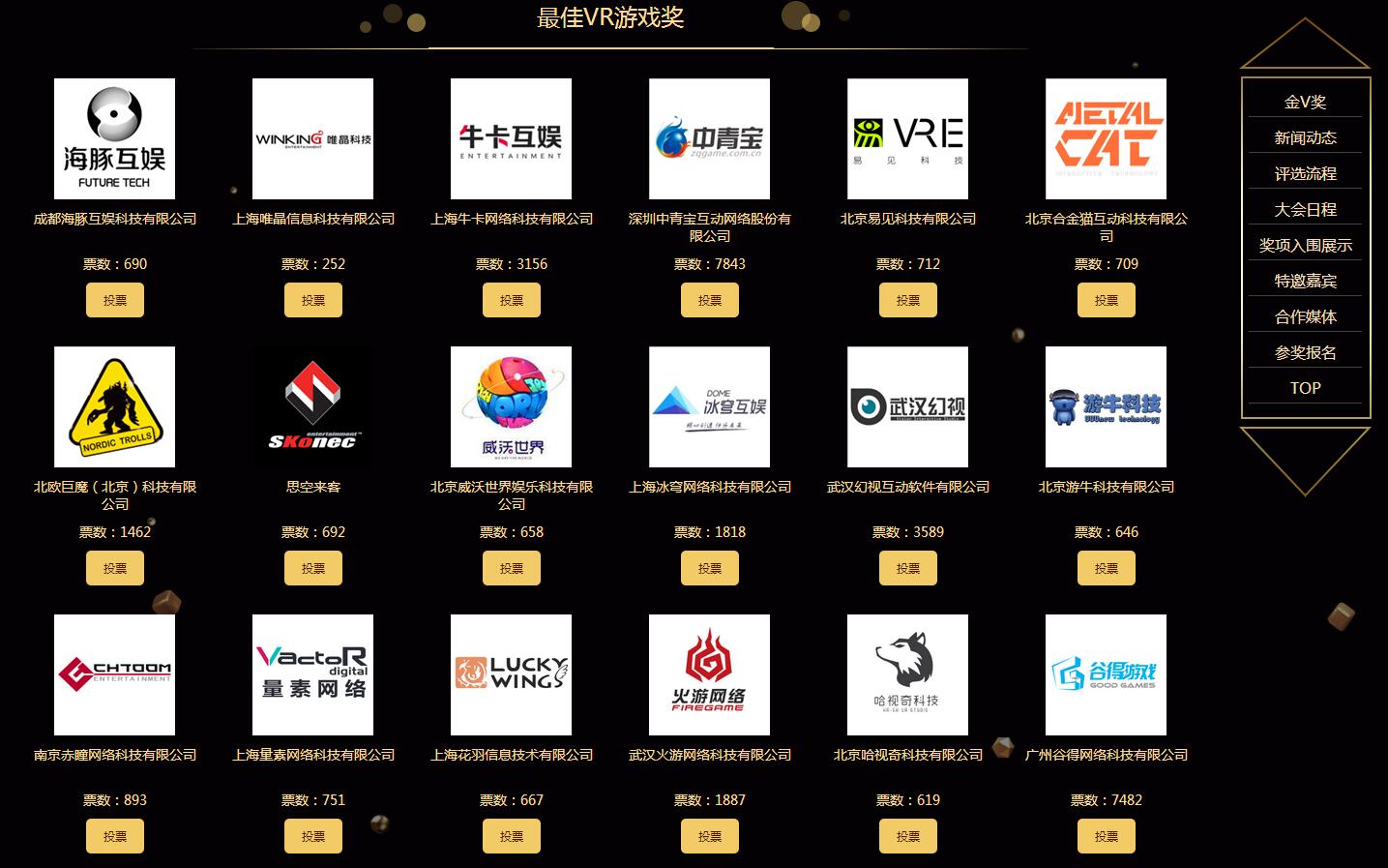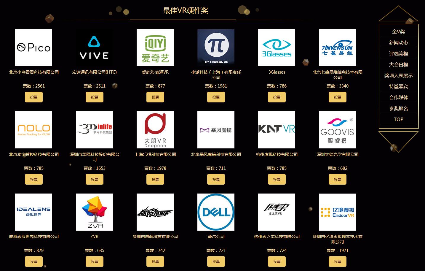 2018虛擬與增強(qiáng)現(xiàn)實(shí)產(chǎn)業(yè)生態(tài)高峰論壇暨“金V獎(jiǎng)”頒獎(jiǎng)盛典將于2018年1月18日在北京•國(guó)家會(huì)議中心盛大啟幕。自評(píng)選報(bào)名開(kāi)啟以來(lái)共有150家VR/AR企業(yè)入圍!1月1日開(kāi)啟海選投票以來(lái),就得到了HTC、pico、瑞立視、超級(jí)隊(duì)長(zhǎng)、網(wǎng)易、百度、京東、戴爾等多家行業(yè)頭部廠商的積極響應(yīng)!目前金V獎(jiǎng)投票空前高漲!此次網(wǎng)上投票海選結(jié)果將作為金V獎(jiǎng)評(píng)審組委會(huì)評(píng)審參考。