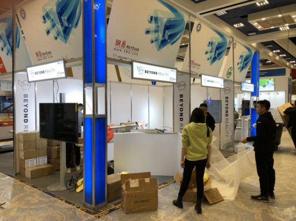 網易的展位位于westgate #1409,展位的兩側擺放著兩臺用于對外展示的電視,除了網易的Logo外,展位上還打出“BEYOND REALITY”的口號,配以一個人像佩戴類似潛望鏡的眼鏡。