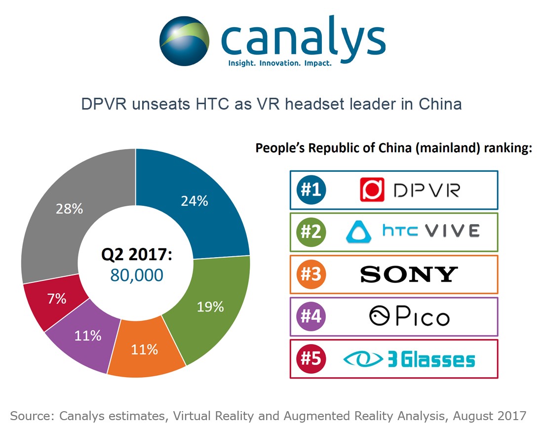 卓有成效的VR商用市場(chǎng)與民用市場(chǎng)布局后,Canalys報(bào)告顯示大朋VR在2017年第二季度已超越HTC VIVE成為中國(guó)市場(chǎng)第一。