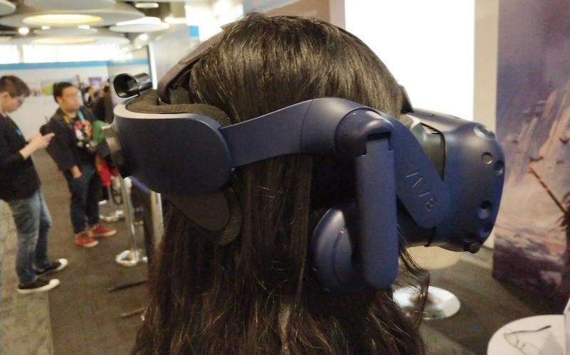 因?yàn)橹耙呀?jīng)試用過(guò)Vive Focus,所以我先來(lái)說(shuō)說(shuō)大家最關(guān)注的Vive Pro帶給我的一些感受。為了更好呈現(xiàn)這款產(chǎn)品的特征,我請(qǐng)現(xiàn)場(chǎng)的一位媒體妹子作為模特,我所有的關(guān)于Vive Pro的照片都是她實(shí)際佩戴的樣子。從這些照片你可以看出,Vive Pro的尺寸依然很大,再加上圖中妹子的頭比較小,所以頭顯看起來(lái)就顯得更大了。盡管如此,Vive Pro的佩戴舒適度卻非常之高,這一方面是因?yàn)閂ive Pro的重量相對(duì)于前代產(chǎn)品有所減輕,而更重要的則是產(chǎn)品的配重設(shè)計(jì)。Vive Pro的重量分布很均勻,我個(gè)人感覺(jué)其主要受力點(diǎn)是頭頂處的頭帶部分,用戶在使用時(shí)不會(huì)有前方或后方偏沉的感覺(jué),如此一來(lái)自然就減輕了負(fù)重感和提升了舒適度。