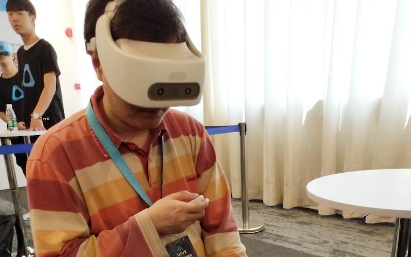因?yàn)橹耙呀?jīng)在幾個(gè)場(chǎng)合中體驗(yàn)過(guò)Vive Focus這款產(chǎn)品,因此現(xiàn)在我就簡(jiǎn)單說(shuō)說(shuō)此次體驗(yàn)的一些新感受。這里我換了一位媒體帥哥作為模特,從圖中看得出來(lái),白色的Vive Focus還是很漂亮的,高級(jí)感十足。