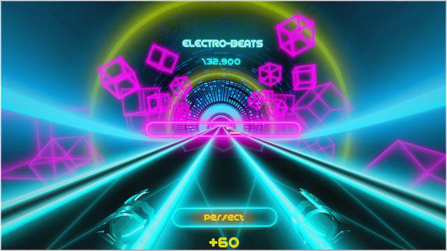 在玩法上,團(tuán)隊最初想做一款射擊類VR游戲,基本玩法是玩家駕駛戰(zhàn)車進(jìn)行射擊對戰(zhàn)。在制作過程中,團(tuán)隊發(fā)現(xiàn)單純的射擊沒有什么快感,反倒是戰(zhàn)車越跑越快、來回躲避障礙的體驗非常刺激,于是就將這個體驗繼續(xù)放大,變成了一款跑酷游戲。在經(jīng)過了PC端《鏡像酷跑》的嘗試之后,團(tuán)隊也順利將游戲搬到了移動端,制作出團(tuán)隊首款移動VR跑酷游戲《CubeRUN》。同時,團(tuán)隊也在開發(fā)過程中逐漸研究出一套在VR環(huán)境里快速運(yùn)動同時避免眩暈的設(shè)計策略,并將其應(yīng)用在《CubeRUN》和之后的移動VR音樂游戲《Electrobeats》上面,成功實現(xiàn)了玩家既能享受高速移動的刺激感,也不會因為高速移動而感到眩暈。