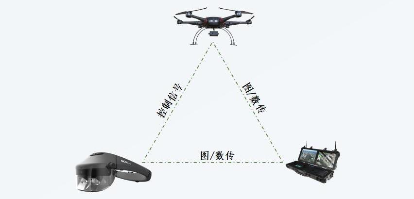 Nibiru 與Ned+ 無(wú)人機(jī)AR監(jiān)控方案,將傳統(tǒng)監(jiān)控系統(tǒng)的前端監(jiān)視設(shè)備(IOT設(shè)備)、傳輸設(shè)備、后端存儲(chǔ)、控制及顯示設(shè)備全部移植到耐德佳Ned+ AR設(shè)備與無(wú)人機(jī)中。由無(wú)人機(jī)攜帶監(jiān)視設(shè)備組成可移動(dòng)前端,通過(guò)Nibiru 圖傳技術(shù)將拍攝內(nèi)容高速傳輸?shù)綗o(wú)人機(jī)地面站,然后無(wú)人機(jī)地面站將數(shù)據(jù)傳輸?shù)侥偷录袾ed+ AR眼鏡中,現(xiàn)階段Nibiru已通過(guò)算法優(yōu)化將圖傳延遲降低至0.5s內(nèi)、數(shù)據(jù)傳輸速率高達(dá)30Mbps。Ned+ AR設(shè)備在該系統(tǒng)中承擔(dān)了畫(huà)面實(shí)時(shí)高清顯示、IOT設(shè)備控制等后端功能。