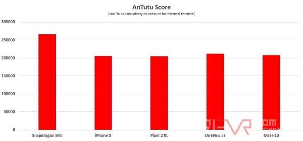 在AnTuTu上,驍龍845的性能比上一代以及iPhone X高出了30%。事實(shí)上AnTuTu在圖形部分給出了相當(dāng)高的比重,同時還包括了處理器、UX以及內(nèi)存性能。參與測試的驍龍845手機(jī)的內(nèi)存和其它測試設(shè)備的內(nèi)存相比要慢一些。