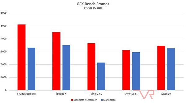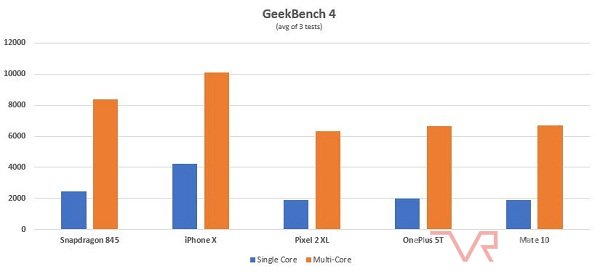 Geekbench 4是CPU的基準(zhǔn)。正如你所見,在該部分驍龍845在所有安卓系列手機(jī)中是最快的,不過蘋果的iPhone X在該部分則排名第一。然而,當(dāng)涉及到AR和VR,GPU的性能仍然比CPU更重要。