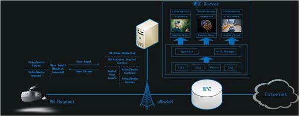 該套系統(tǒng)使用了目前業(yè)界領先的GPU虛擬化技術,其技術特點為單服務器即可支持多用戶VR業(yè)務并發(fā);MEC架構的引入使VR渲染下沉到通信邊緣網絡,一方面增強了畫面質量,另一方面降低了網絡時延。