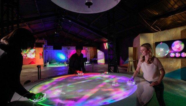 《a (i) r hockey》是以圓形的臺(tái)為舞臺(tái),分為紅、藍(lán)、綠的3個(gè)隊(duì)一起玩的游戲。利用AR進(jìn)行顯示的包(球)和對(duì)用戶使用的馬雷進(jìn)行實(shí)時(shí)跟蹤,利用投影映射,在桌子上投影影像。