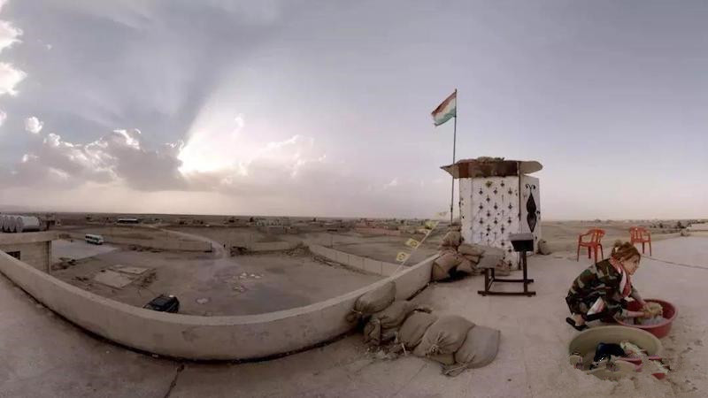 觀感:本片的特別之處在于一些片段中的現(xiàn)實(shí)場景與虛擬手法的結(jié)合。在部分?jǐn)⑹庐嬅嬷?,本片采用了手繪動畫特效和截取平面影像的方式,在VR影視創(chuàng)作上有一些創(chuàng)新之處。同時,本片也充分發(fā)揮了全景拍攝在紀(jì)錄片制作上的優(yōu)勢,讓觀眾在短短幾分鐘時間里仿佛置身于戰(zhàn)火紛飛的伊拉克,同時也對太陽女兵充滿了敬意與同情。
