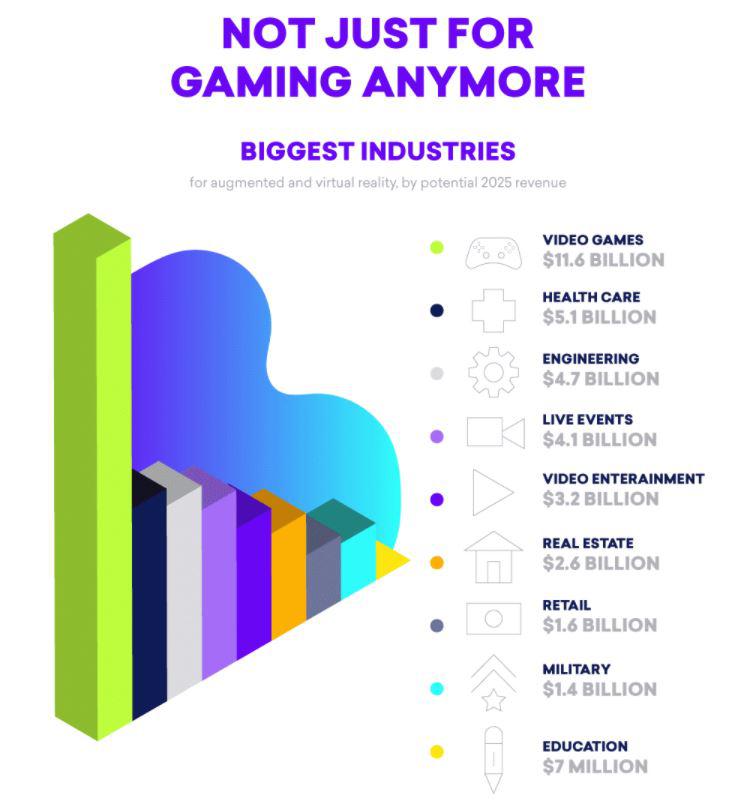 根據(jù)“AR不僅僅適用于游戲”報(bào)告,該信息圖列出了到2025年AR行業(yè)市場(chǎng)收入較大的領(lǐng)域。盡管電子游戲以驚人的116億美元(USD)排名第一,但醫(yī)療保健和工程業(yè)務(wù)分別為51億美元和47億美元。從潛在的收入方面來(lái)看,軍事和教育分別為14億美元和700萬(wàn)美元。