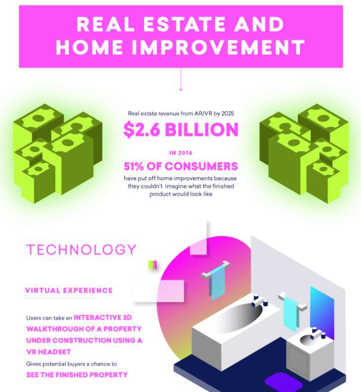 該信息圖的第二部分探討了AR技術(shù)在多個(gè)不同領(lǐng)域的應(yīng)用。預(yù)計(jì)2025年潛在收入為26億美元的房地產(chǎn)和家居裝飾行業(yè)正在利用該技術(shù)幫助消費(fèi)者可視化家中可以看到的家裝產(chǎn)品。據(jù)報(bào)道,借助IKEA Place等應(yīng)用程序,消費(fèi)者可以在訂購(gòu)產(chǎn)品之前查看產(chǎn)品是否適合他們。