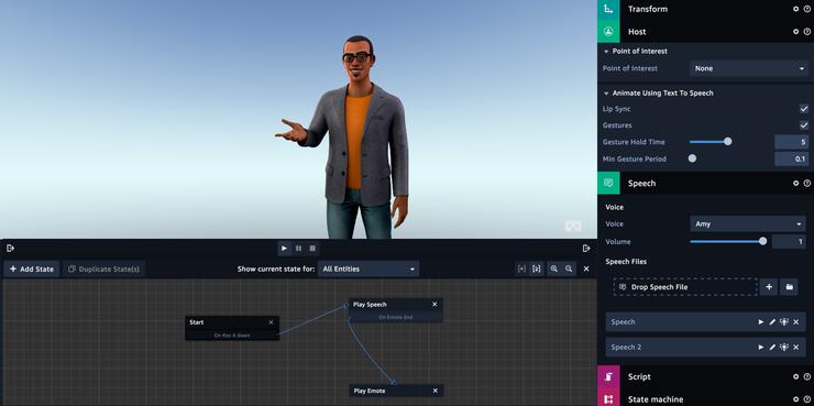 通過Sumerian的演示,可以看到拖放式應(yīng)用編輯器,3D對(duì)象庫,編寫自動(dòng)化場(chǎng)景腳本Visual State Machine以及查看創(chuàng)建AI Host的過程,用戶可以在這些VR體驗(yàn)中與之進(jìn)行對(duì)話。