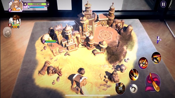 場景的震撼只是基本,關鍵還是要看AR戰(zhàn)斗的效果!實際戰(zhàn)斗手感雖然沒有發(fā)生很大變化,但是技能特效在AR場景中張力更強,演出效果滿分!除去戰(zhàn)斗特效的升級,接踵而來的機關設置成功刷新了對AR玩法可能性的認知。震動設備讓角色逃離颶風,輕輕吹氣驅走煙霧,將虛擬游戲內容與現(xiàn)實肢體交互相結合,這樣的游戲設計真是讓人佩服得五體投地!