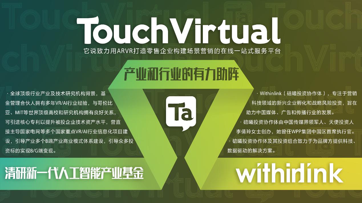 它說(英文名TouchVirtual)是一家以打造ARVR營銷平臺為目標(biāo)的公司,曾在2016年7月獲得數(shù)百萬元天使輪投資,并于近期獲得了清研新一代人工智能產(chǎn)業(yè)基金、第十區(qū)VRAR孵化基金和Withinlink(碚曦投資協(xié)作體)的千萬人民幣級別Pre-A輪融資。