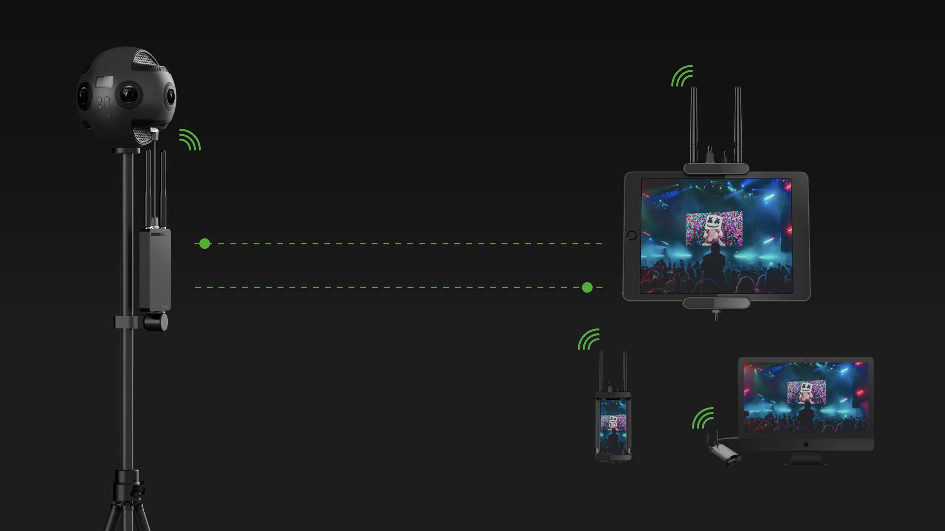 目前市面上有些設(shè)備廠商提供了Wi-Fi傳輸?shù)慕鉀Q方案。但是Wi-Fi的頻段有限且信號(hào)容易被干擾,圖像傳輸?shù)姆€(wěn)定性面臨極大挑戰(zhàn)。據(jù)此,Insta360已經(jīng)研發(fā)了一款特制的遠(yuǎn)距離高清圖傳系統(tǒng)來(lái)解決該痛點(diǎn)。