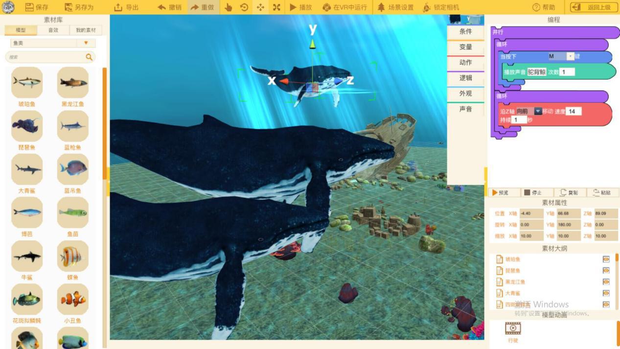 同樣以海洋館為例,大朋(DPVR)E3親子VR游戲套裝的核心軟件《格靈世界》自帶強大的三維建模功能和編程功能。孩子可以首先借助海洋生物的三維模型,快速地生成一個完整并且配比合理的的海洋生態(tài)系統(tǒng)。隨后借助“編程”功能,按照嚴密的邏輯賦予海洋生物正確的活動規(guī)則,讓海底世界動起來。