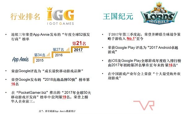 在國(guó)際權(quán)威機(jī)構(gòu)App Annie發(fā)布的“年度52強(qiáng)發(fā)行商”榜單中,IGG連續(xù)三年上榜,排名高歌猛進(jìn),于2017年榮升至第21位,在上榜華人企業(yè)中,僅次于騰訊和網(wǎng)易;在權(quán)威手游網(wǎng)站“PocketGame.biz”推出的“2017年全球50大移動(dòng)游戲開發(fā)商”排名中,IGG位列第19位;同時(shí)在Google和權(quán)威品牌研究機(jī)構(gòu)BrandZ聯(lián)合發(fā)布的“2018中國(guó)出海品牌50強(qiáng)”中位列第16名,并獲評(píng)Google頒發(fā)的“成長(zhǎng)最快移動(dòng)游戲品牌”。