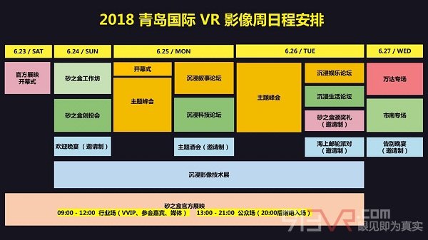 砂之盒官方展映是 2018 青島國際 VR 影像周的主要板塊之一。6 月 23 日至 26 日,展映以行業(yè)場(chǎng)和公眾場(chǎng)的形式向觀眾開放。官方展映一共分為三個(gè)部分:立式 VR 、VR 劇場(chǎng)和 VR 裝置。據(jù)介紹,此次砂之盒沉浸影像展邀請(qǐng)了全球頂級(jí)VR創(chuàng)作團(tuán)隊(duì)和他們的作品,包括 Baobab、Google Spotlight、Fable、Felix & Paul、BBC、Pinta、Sandman、聯(lián)合國等。影像周共收集了來自 20 多個(gè)國家近 50 部在圣丹斯、翠貝卡、威尼斯、戛納、釜山等國際電影節(jié)獲獎(jiǎng)/入圍的 VR 作品,其中一半作品為亞洲首映。在組委會(huì)首次公布的 展映作品中,《烈山氏》、《地三仙》、《鼓浪嶼的三世情書》《卡羅大冒險(xiǎn):巨蛋》、《窗》、《萬物流動(dòng)》和《微觀巨獸》這7部都是由中國團(tuán)隊(duì)創(chuàng)作的。