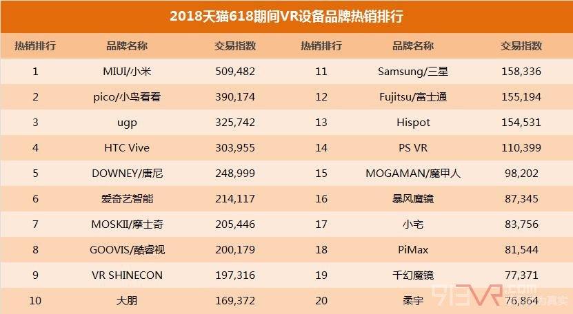 而在該榜單中的品牌商中,小米在天貓平臺(tái)的交易熱度高居第一,Pico則緊隨其后,HTC位居第四。