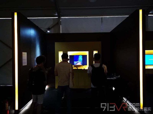 場館的左右兩側(cè)及中部位置是立式VR區(qū)域,在這些區(qū)域展映立式VR單元的VR內(nèi)容。所謂立式VR,就是需要觀眾站立觀看、部分作品包含弱交互的VR內(nèi)容,這部分內(nèi)容也是我最感興趣的。在場館的另外一側(cè)盡頭則是VR 裝置區(qū)域,相對于立式VR,VR裝備內(nèi)容具有更強的交互性,內(nèi)容在交互方面有點類似游戲。