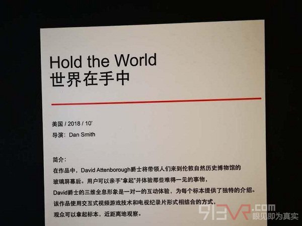因為時間原因,我首先體驗的是立式VR單元的內(nèi)容,而《世界在手中》是我首先體驗的作品。在作品中我進入了一家博物館,一位和藹的英國紳士為我講解了一些關(guān)于古生物的知識。本作將實拍內(nèi)容與CG內(nèi)容相結(jié)合,同時還加入了弱交互元素,當我進入不同的房間,用手柄從不同的柜子中抓取不同的古生物標本,關(guān)于標本的更多內(nèi)容(包含真人講解與動畫呈現(xiàn))就顯現(xiàn)在我面前了。在我看來,這種呈現(xiàn)方式非常適合VR教育,當一個孩子漫游在活靈活現(xiàn)的博物館之中,當生動活潑的視聽影像代替了傳統(tǒng)的文字圖片,我想這一切必然會進一步激發(fā)孩子對于科學與知識的好奇與熱情。