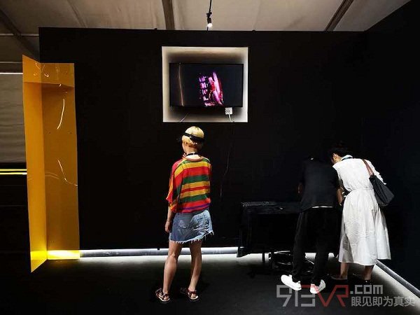 立式VR單元的每一個觀影區(qū)多為這樣的結(jié)構(gòu):左右通過兩扇墻壁與其他區(qū)域隔離,前方是PC、顯示器與工作人員操作區(qū),側(cè)面墻壁上貼有一張紙質(zhì)作品介紹。值得一提的是本次活動的視覺設(shè)計,黑黃相見的配色既體現(xiàn)出強烈的對比感,又襯托出VR“黑科技”的酷炫特質(zhì)。
