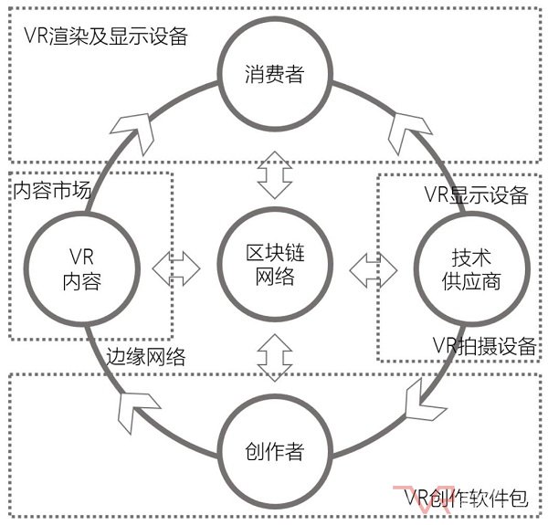 張悅提到,消費(fèi)者、內(nèi)容分發(fā)渠道(內(nèi)容市場)、內(nèi)容創(chuàng)作者和上下游VR技術(shù)供應(yīng)商之間的數(shù)據(jù)存儲、傳輸和交互都是通過邊緣網(wǎng)絡(luò)來完成的,而他們之間的交易、確權(quán)則是通過區(qū)塊鏈網(wǎng)絡(luò)來完成。通過全新的VR渲染技術(shù)和顯示設(shè)備,滿足消費(fèi)者降低體驗VR門檻的訴求,通過邊緣網(wǎng)絡(luò)分布式的存儲和云化VR的方式滿足創(chuàng)作者平臺兼容、降低傳輸帶寬以及版權(quán)保護(hù)的訴求,通過不可篡改、全程追溯、公開透明的區(qū)塊鏈智能合約體系完成版權(quán)確權(quán)、降低創(chuàng)作成本和縮短賬期及渠道費(fèi)率的訴求,以此建立一條完整的鏈條。