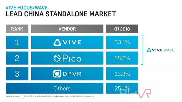 同樣是IDC的數(shù)據(jù)顯示,在2018年第一季度的中國(guó)VR一體機(jī)市場(chǎng)中,HTC Vive推出的VR一體機(jī)Vive Focus占據(jù)了33.1%的市場(chǎng)份額并排名第一(Pico和大朋分別排名第二/三位),而其移動(dòng)VR內(nèi)容開(kāi)放平臺(tái)Vive Wave 也已支持中國(guó)排名前兩位的VR一體機(jī)廠商(HTC Vive和Pico)的產(chǎn)品。