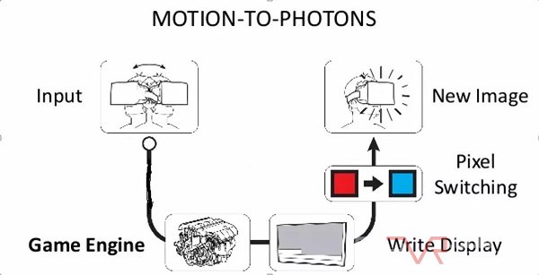 Motion-To-Photons延時(shí)指的是在運(yùn)行VR場景的情況下,從用戶的頭部移動開始,一直到這一信號通過VR頭盔輸出的光學(xué)信號映射到人眼所需的時(shí)間。一般認(rèn)為,這一延時(shí)大于20毫秒會導(dǎo)致用戶體驗(yàn)到較為明顯的眩暈。