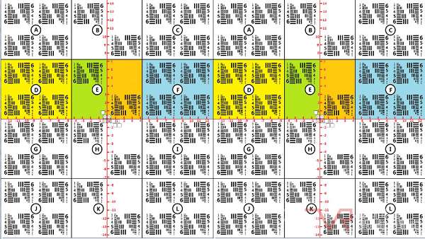 比如,下圖被美國軍方用來檢測鏡片各區(qū)域的清晰度。把圖放入頭盔中,你能清晰看到圖像中間水平和垂直紅線的最大刻度是多少?