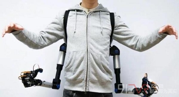 事實上,這不是Saraiji第一次研發(fā)依附在人身上的機器人:他和研究人員之前創(chuàng)造了一套名為MetaLimbs的可穿戴機械手臂,佩戴者用腳便可親自控制該設(shè)備,而不需要其他操作者。然而,與他人共同控制自己的機械手臂則是一個完全不同的概念。Saraiji說:“下一步,我們想探索如果有另一個人能從某種意義上依附并控制你的身體,會發(fā)生什么?能否幫助人類進行一些更復雜的工作?” 二、機械臂的構(gòu)造 這款機器人背包內(nèi)配有一臺負責遠程傳輸數(shù)據(jù)的微型電腦,同時,它還連接了一臺微型控制器,這樣才能精確定位機械手臂的位置,并計算需要在機械關(guān)節(jié)上施加多少壓力。每條機械手臂都與背包相連,手臂上的七個關(guān)節(jié)能確保它做出各種靈活的動作。同時,還有一個配有兩個攝像機的頭部與手臂相連,它能提供遠程操作者清晰的視野,當操作者轉(zhuǎn)動他們的頭部時,攝像機也會做出相應(yīng)的動作。這款可穿戴手臂由一個重達21磅的電池供電,可維持機械手臂工作長達一個半小時。