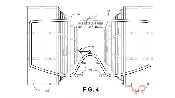 該專利提交于2017年3月。專利顯示,與穿戴或攜帶的計算設備相連,AR眼鏡可以在視場中疊加一個項目到下一個項目的路線規(guī)劃指示。此外,它還能指示工人將特定的物品放置在倉庫中的特定位置。
