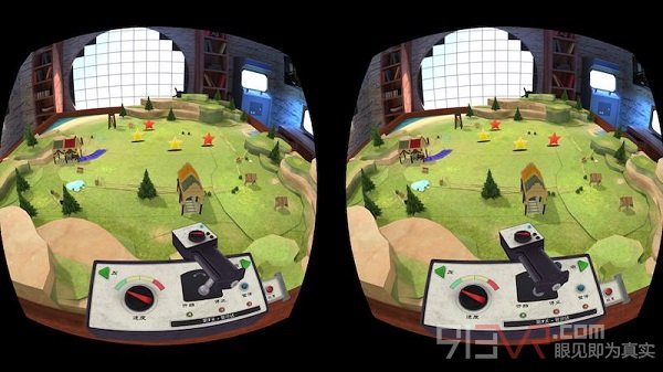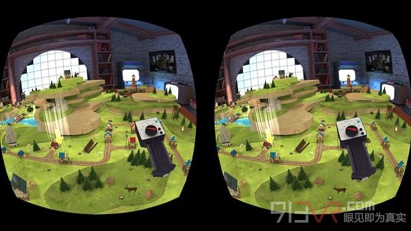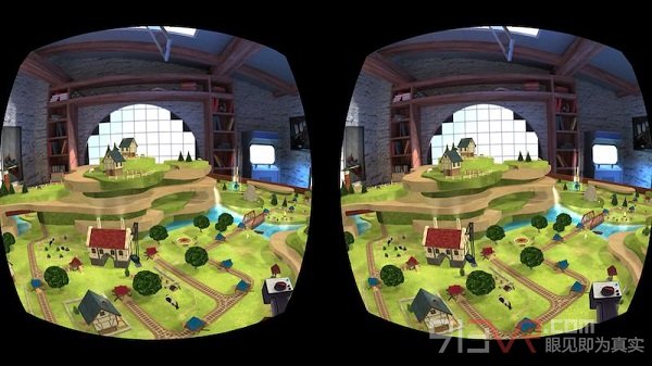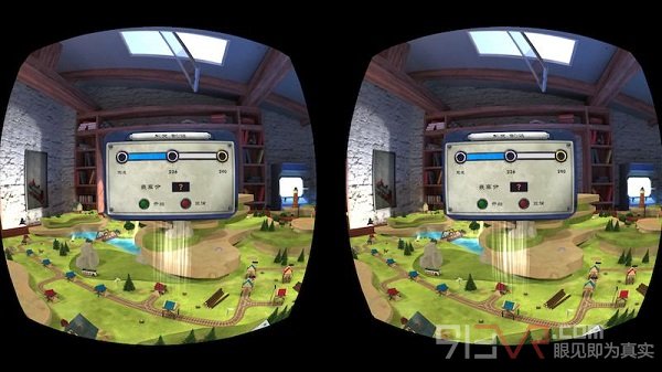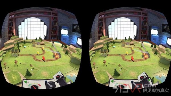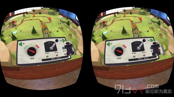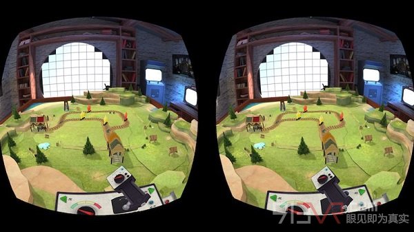 啟動(dòng)游戲,首先進(jìn)入視野的就是一個(gè)大大的沙盤,里面包含了眾多的火車站和各種地形。看到這里,兒時(shí)玩玩具的感覺馬上就出現(xiàn)了,只不過現(xiàn)在這個(gè)“VR玩具”看起來更高端更好玩。在游戲中,我的手柄變成了一個(gè)帶儀表的控制器,通過這個(gè)控制器,我可以選擇不同的火車站也就是關(guān)卡,這種設(shè)計(jì)與流行的多關(guān)卡手游(比如《憤怒的小鳥》)是一樣的。